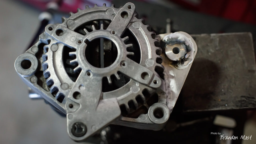 The LS alternator comes apart really easy and allows that front case to come off. Above you see it sitting on the original alternator to see how far you have to move the bolt hole.