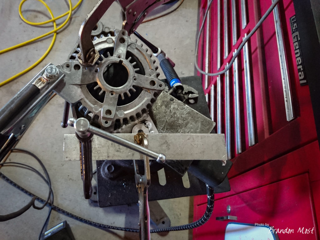 First I welded a tab onto the case. I drilled a 1″ hole in the tab and machined a bushing on the lathe that allowed me to set the depth the same as the 4Runner one. I clamped a brace across the original tab to square everything up before welding.