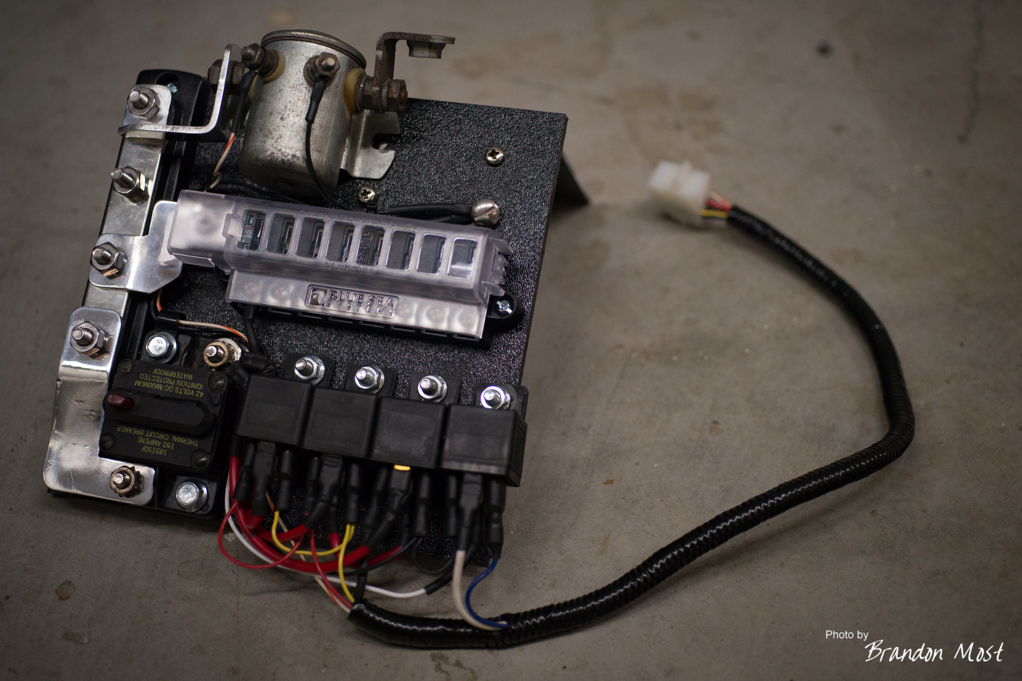 To mount this new distribution center I added an “L” Bracket to the battery tie down on the top.  Then used a simple 1″ wide strap tied back to the body to help stabilize the bottom.